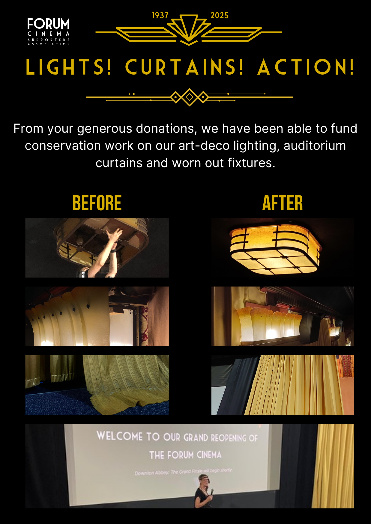 The Forum Cinema Supporters' Association, is a small group of dedicated Forum fans who raise money for the cinema to make refurbishments that will improve the customers' experience in our lovely, friendly little cinema. They have been fundraising to update the lights curtains and drapes in the auditorium, but once that is complete they will turn their attention to other aspects of the cinema that require some TLC.